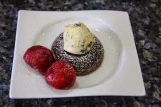 6.Bake for 7-8 minutes.Take out of the oven,let cool for 1 minute and carefully invert onto serving plate.Dust with sugar or place a scoop of Ice cream on top and fruit.