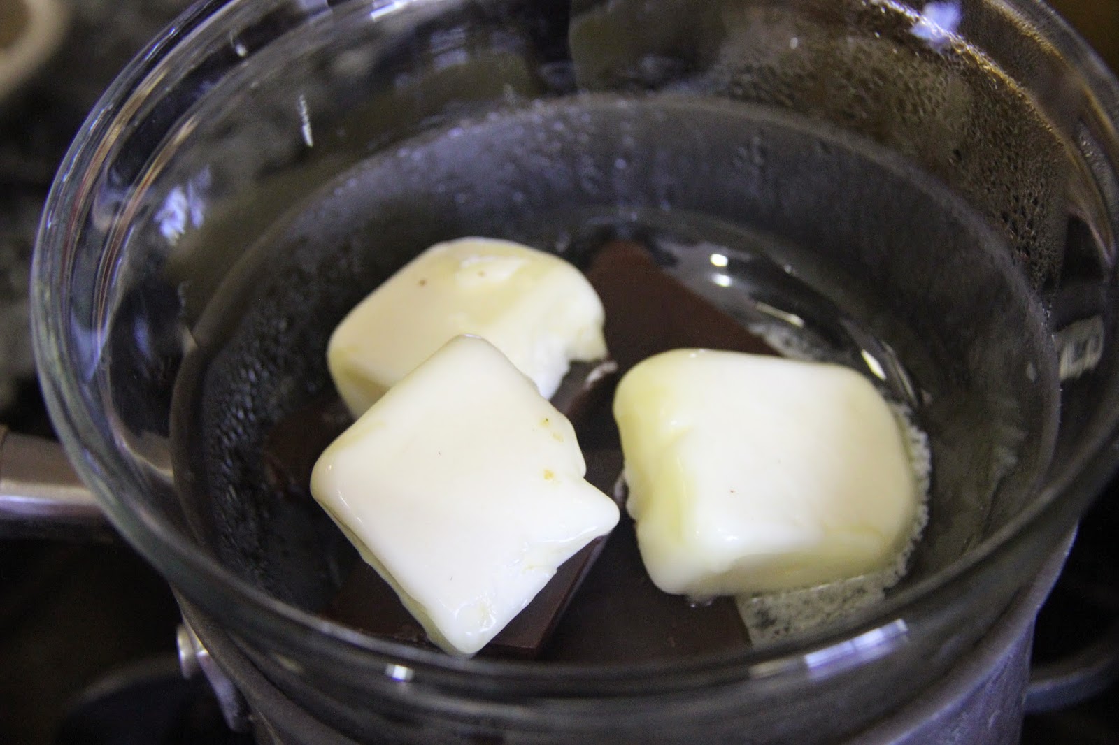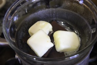 1.Heat oven to 425F. Melt the butter and chocolate on a double boiler and stir until combined.Keep aside to cool for 2 minutes.