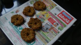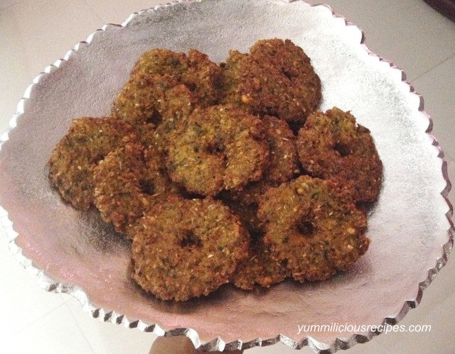 4.Heat oil in a pan in medium heat.Take one lime sized ball of the mixture and press down to a flat cake on parchment paper or a cover.Gently press a hole in the center with your index finger.
