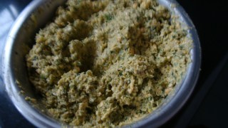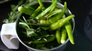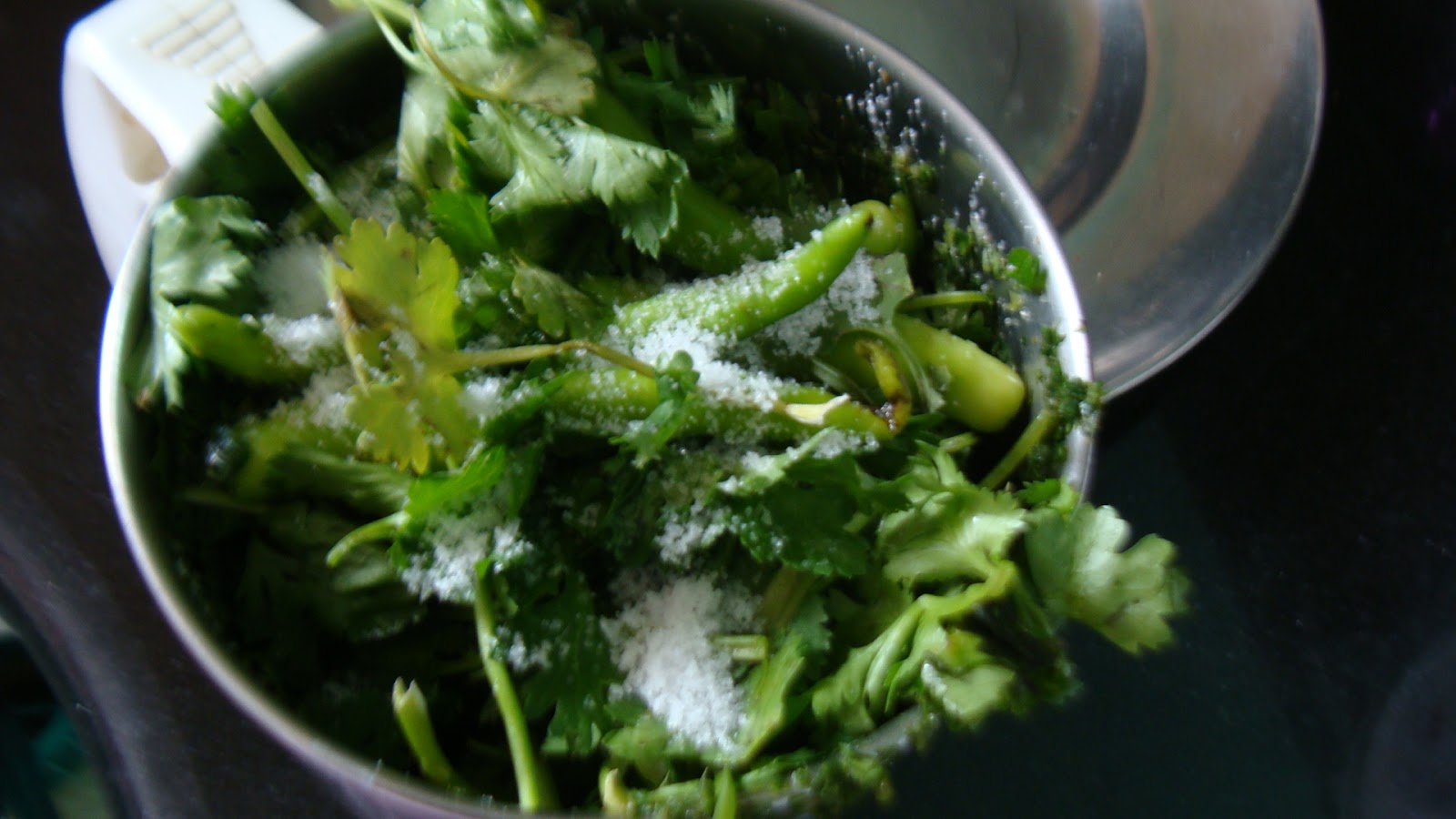 1.Grind the curry leaves, green chili and the Cilantro to a coarse paste