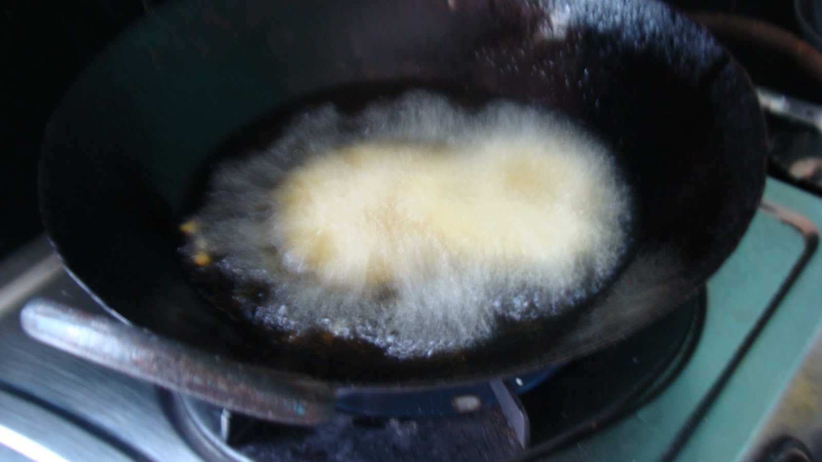 5.Lift the paper and invert the cake onto your palm and gently slide it into the oil.Let cook until golden brown and drain onto a paper towel.
