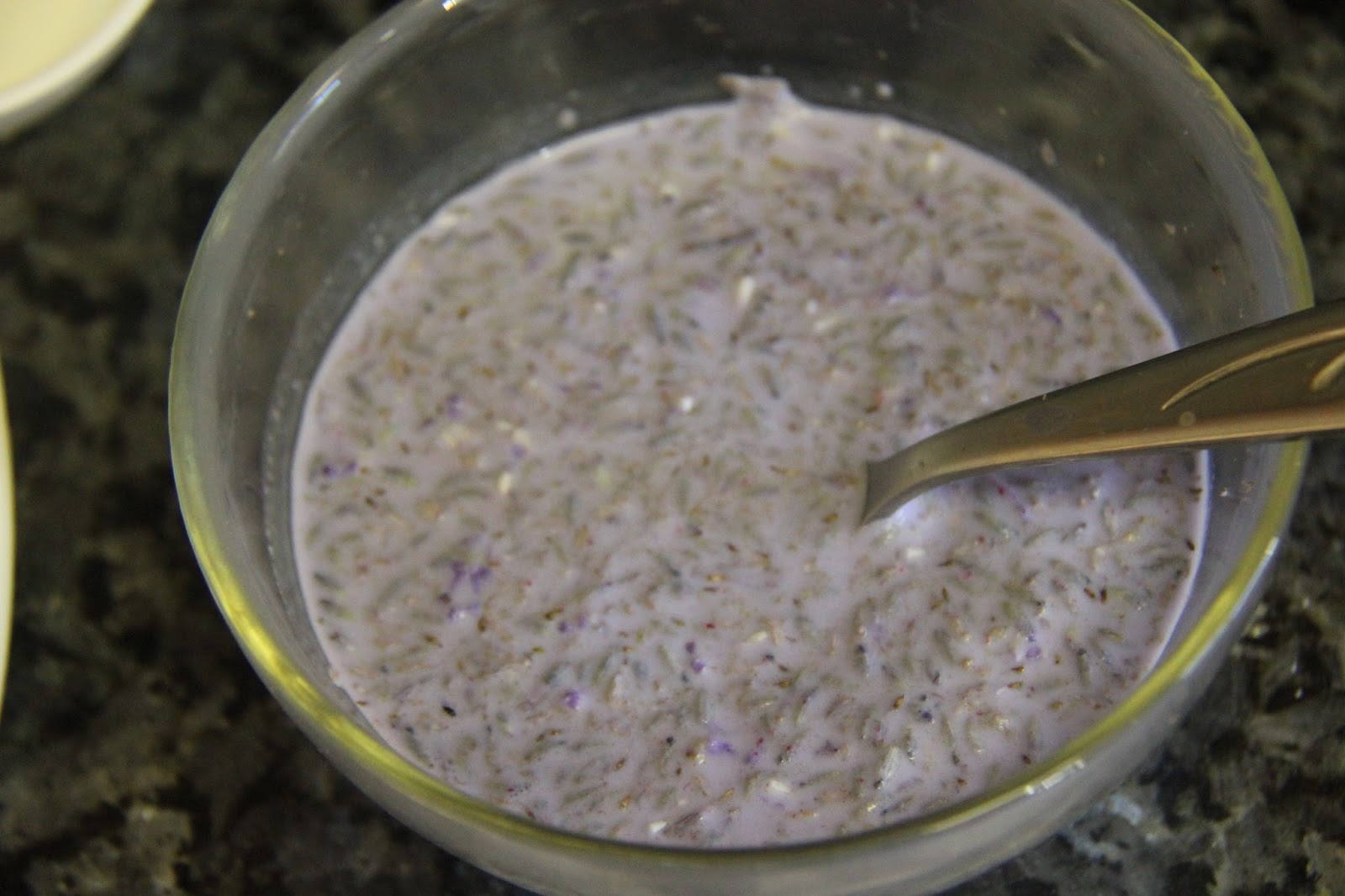4.Heat the milk with the lavender perils for 30 seconds in the microwave and let cool to room temperature.Add color to the milk itself if using.