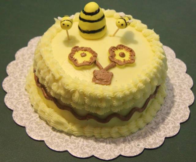 8.For the icing whip the extract and zest with the buttercream, you can add yellow color if you like.Place 1 teaspoon of icing on the cake circle and then place one layer of cake on the cake circle on it.Place about a cup of icing on top and spread evenly with spatula(you can also put some fresh raspberries).Place the second layer on top(make sure the bottom smooth side is facing up so you have an even surface(If you have a cake that has risen and is not flat enough to ice it level it and then place it crumb side down).Place 1 1/2 more cups of icing on top and start spreading on the top pushing it to the sides and then ice the sides as well.Pipe your favorite design,I used lemon icing with a shell tip to pipe the details and added the fondant honeybee and flower accents.