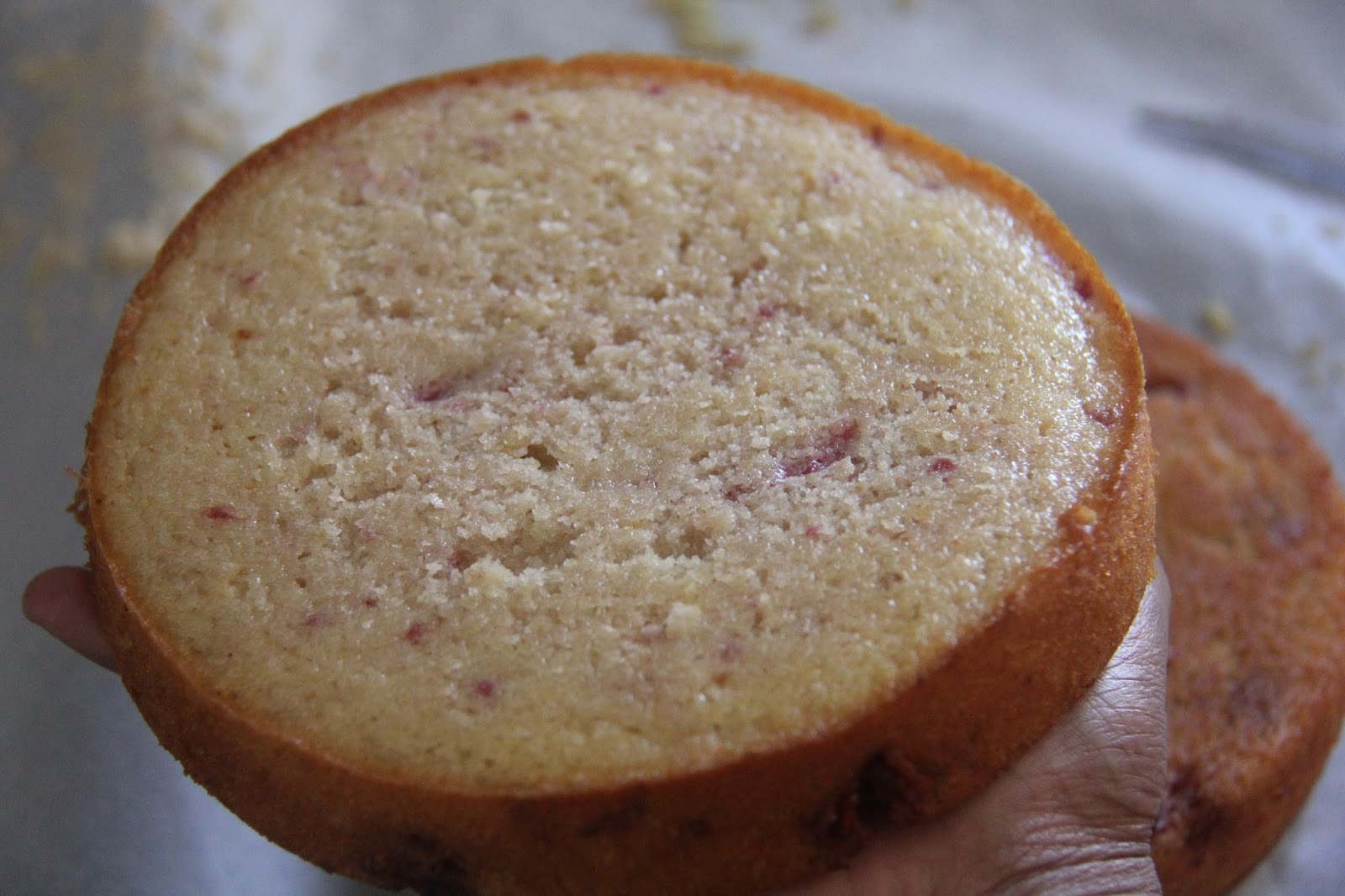 4.Add the flour slowly and fold until incorporated, do not over beat.Fold the fresh raspberries.