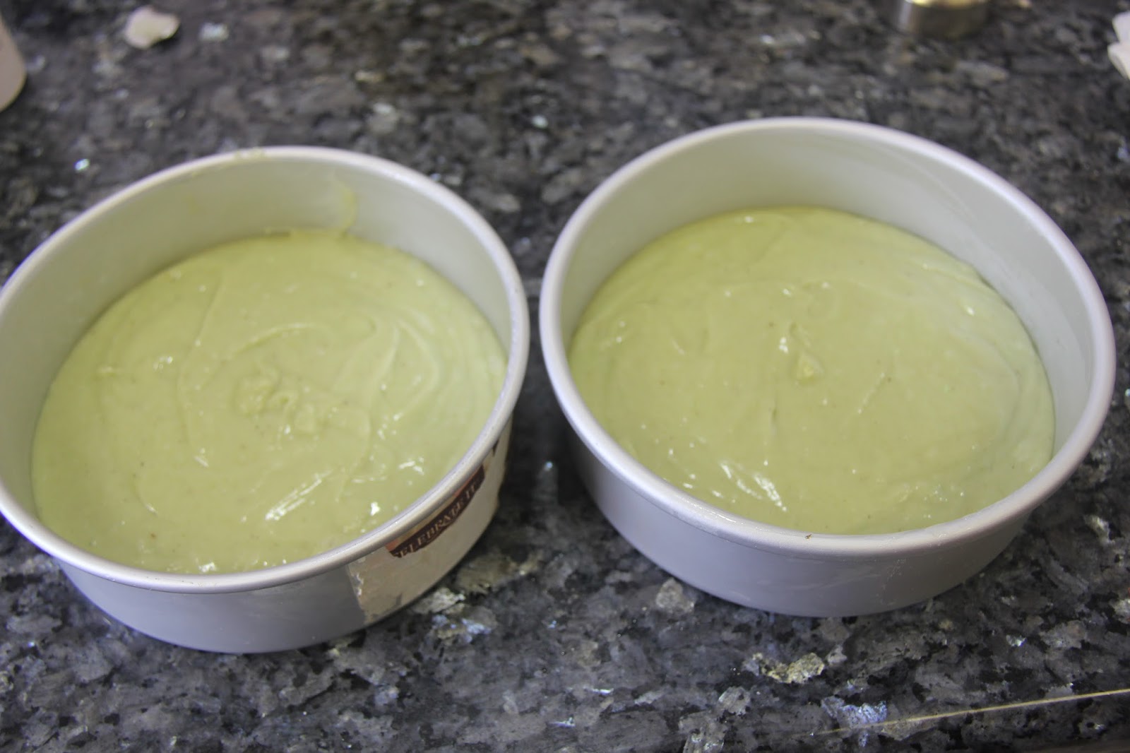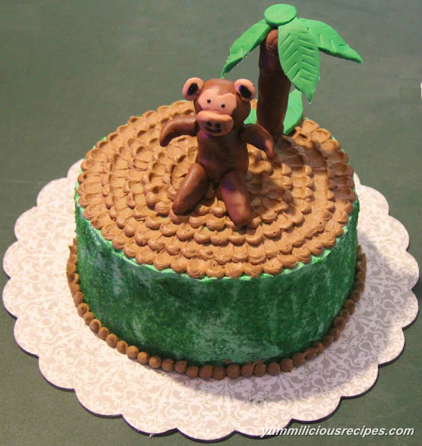 7.For the icing whip the extract with the buttercream, you can add green color if you like.Place 1 teaspoon of icing on the cake circle and then place one layer of cake on the cake circle on it.Place about a cup of icing on top and spread evenly with spatula.Place the second layer on top(make sure the bottom smooth side is facing up so you have an even surface(If you have a cake that has risen and is not flat enough to ice it level it and then place it crumb side down).Place 1 1/2 more cups of icing on top and start spreading on the top pushing it to the sides and then ice the sides as well.Pipe your favorite design,I used colored sugar to coat the sides of the cake then used a brown icing with a round tip to pipe the details,the pattern on the top was done by piping drops of icing and swipe it inward with a small spoon repeat in concentric circles starting from the outside to the inside.The monkey and the tree were made with fondant.
