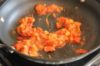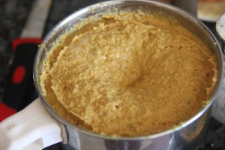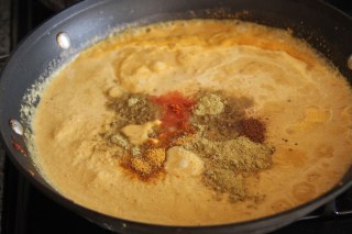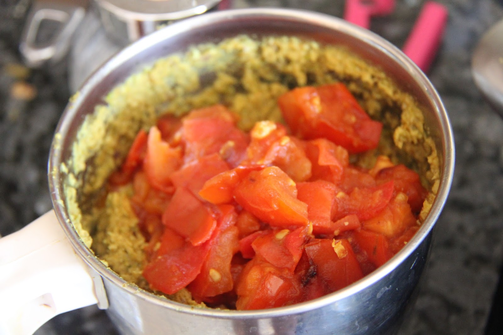 7.Transfer all of the paste into the same pan , add 2 cups of water and bring to a light boil.Now add the spice powders and mix well.Check your taste and adjust spice/salt accordingly.