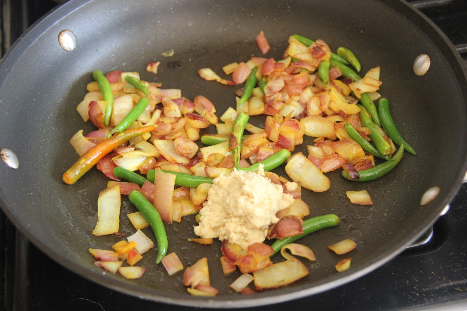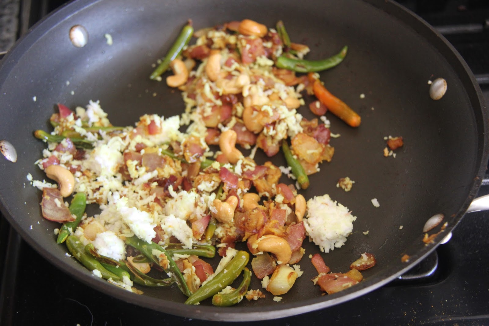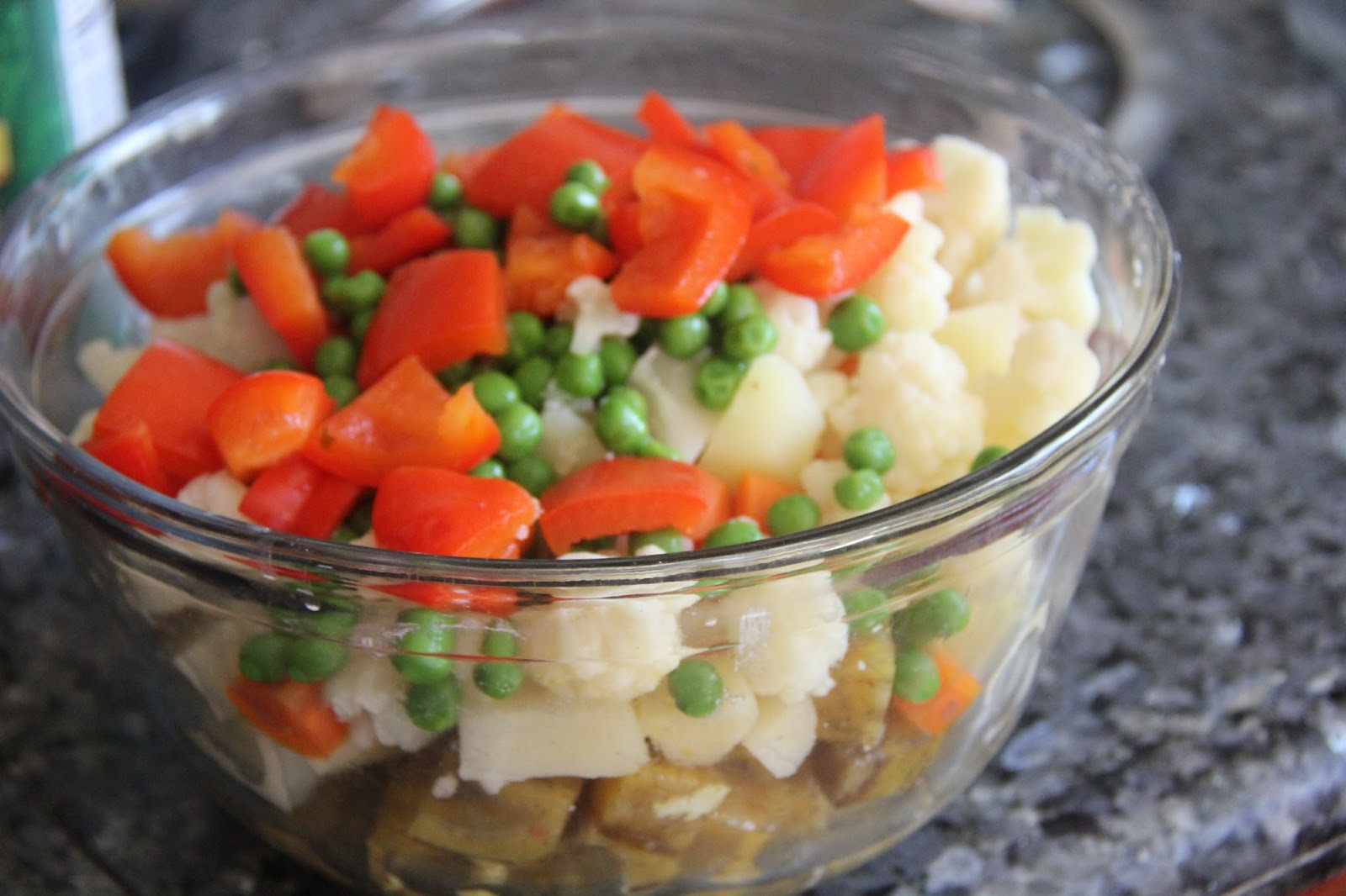 1.Bring water to a boil in a saucepan and add sufficient salt.Now add the potatoes and blanch them for 5 minutes and remove from water and keep aside, now add carrot and blanch for 2-3 minutes and keep aside,add french beans and blanch for around 5 minutes and keep aside,repeat for peas for 2-3 minutes(frozen peas take 1 minute) and cauliflower for 3 minutes and capsicum for 2 minutes.The goal is to get the veggies cooked but not make them super soft, they have to be firm but cooked.