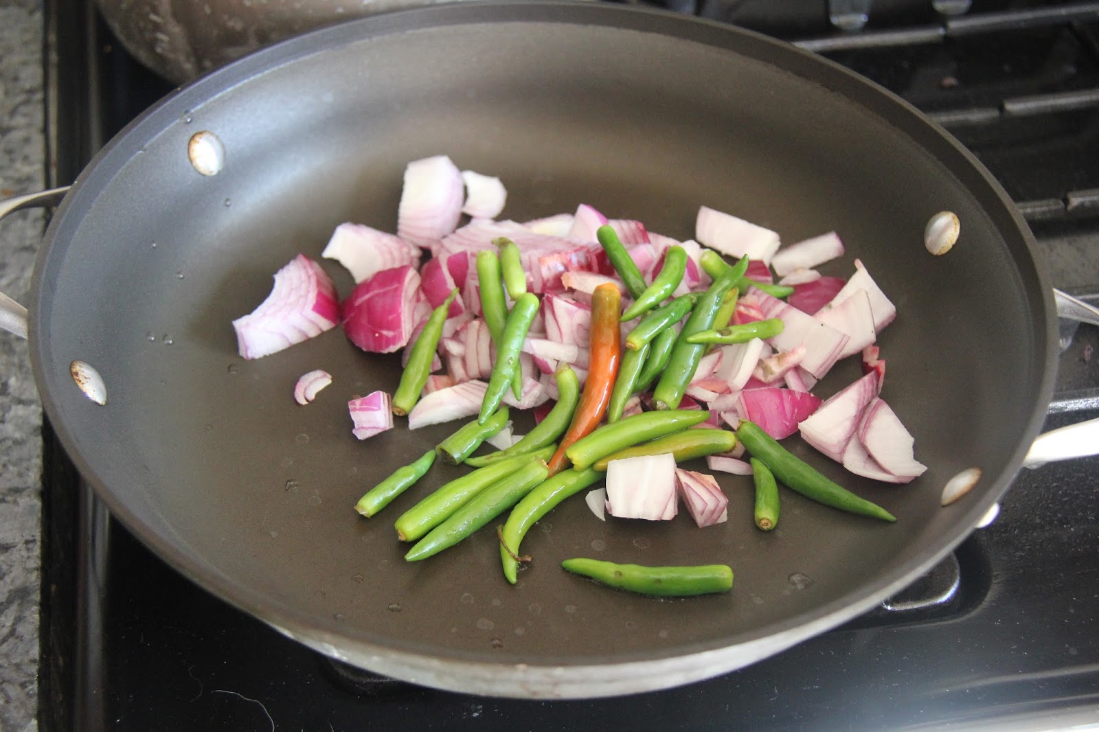 2.Heat Oil in a pan and add the green chili,turmeric and onions, saute until onions turn translucent.