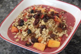 2.Transfer the contents to 2 bowls and top it off with dry fruit, chopped fruit and granola and enjoy!