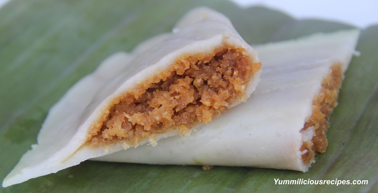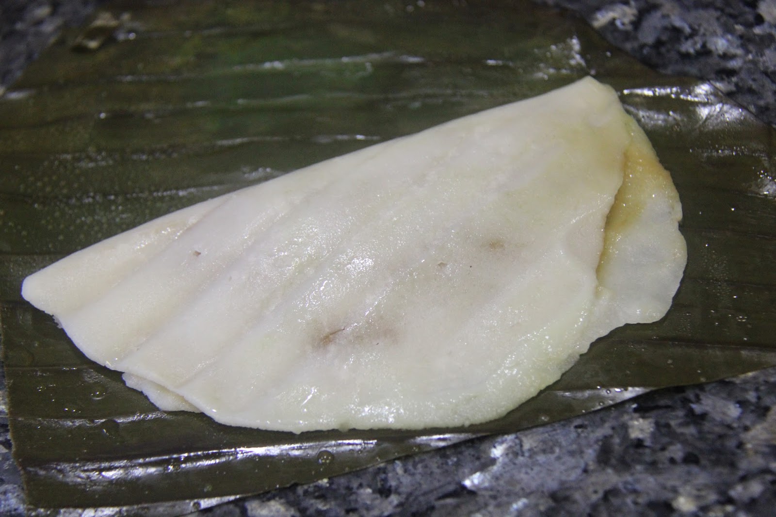 7.Lift the banana leaf and fold it into half onto the filled half of the rice flour.Repeat for all four of them.