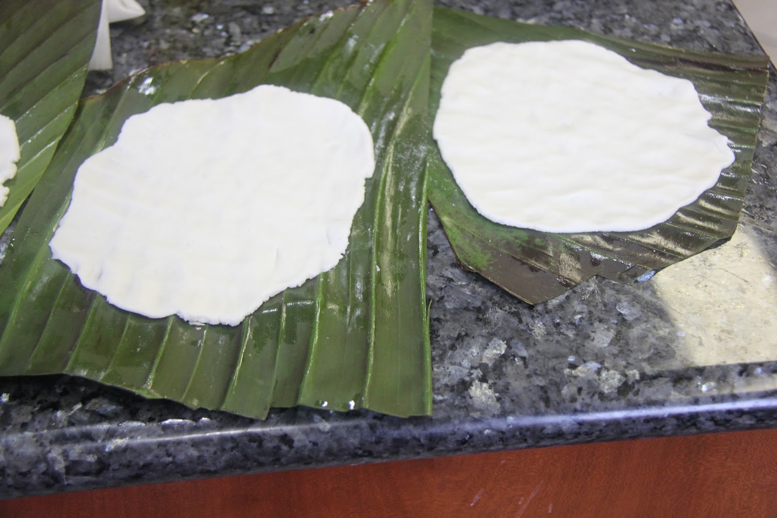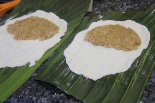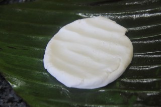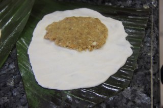 5.Now divide the rice flour into 4 balls and with your fingers gently press each ball onto the banana leaf until flat and a 1-2cm layer is formed.