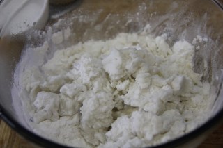 6.Divide the coconut mixture into 4 balls and place them onto one side of the pressed rice flour.
