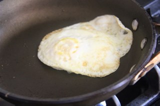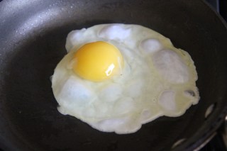 2.Crack the egg on the hot pan, turn down the flame to medium and let cook for about 20 seconds.