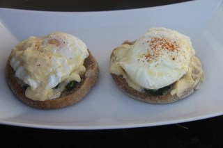 This is a breakfast dish where poached eggs are topped off over an english muffin and dressed with Hollandaise sauce.There are multiple variations of this dish, I am using spinach for “Eggs Florentine”, other versions use ham,mushrooms, salmon, bacon, avocado, chorizo, salsa etc.