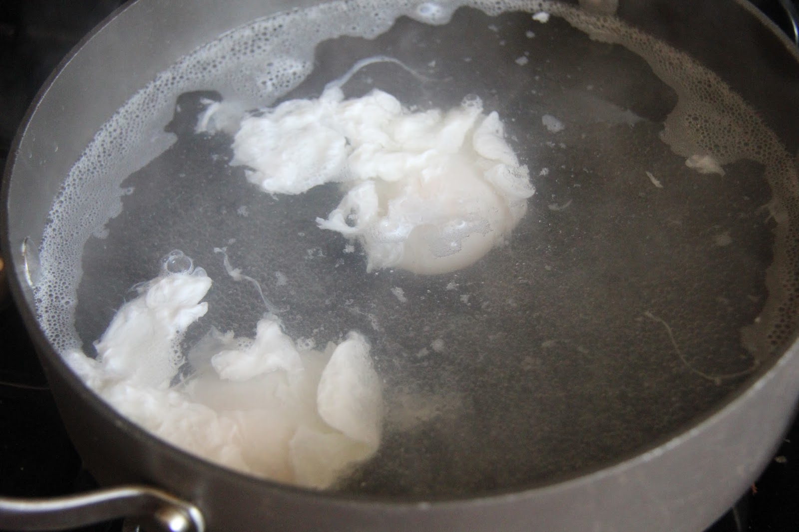 1.In a shallow pan bring water to a boil, the water height should be about 3 inches.Add Vinegar and salt and once it reaches to a boil turn down the heat to medium and let simmer.Crack an egg into a bowl and gently slide it into the simmering water.Make sure the lower rim of the bowl touches water while sliding it in, this ensures the eggs doesn’t spread around too much.Let cook for about 3 minutes.