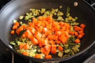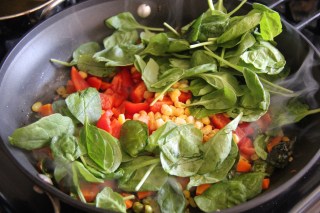 3.Add the peas,corn,carrot,sundried tomatoes and pine nuts and saute for 2-3 minutes, now add the red bell pepper and the spinach and add six cups of water and salt and let come to a boil.