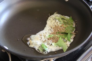 1.Heat butter in a pan and add mustard seeds and let splutter, then add the cumin seeds and saute, now add the curry leaves and let splutter.