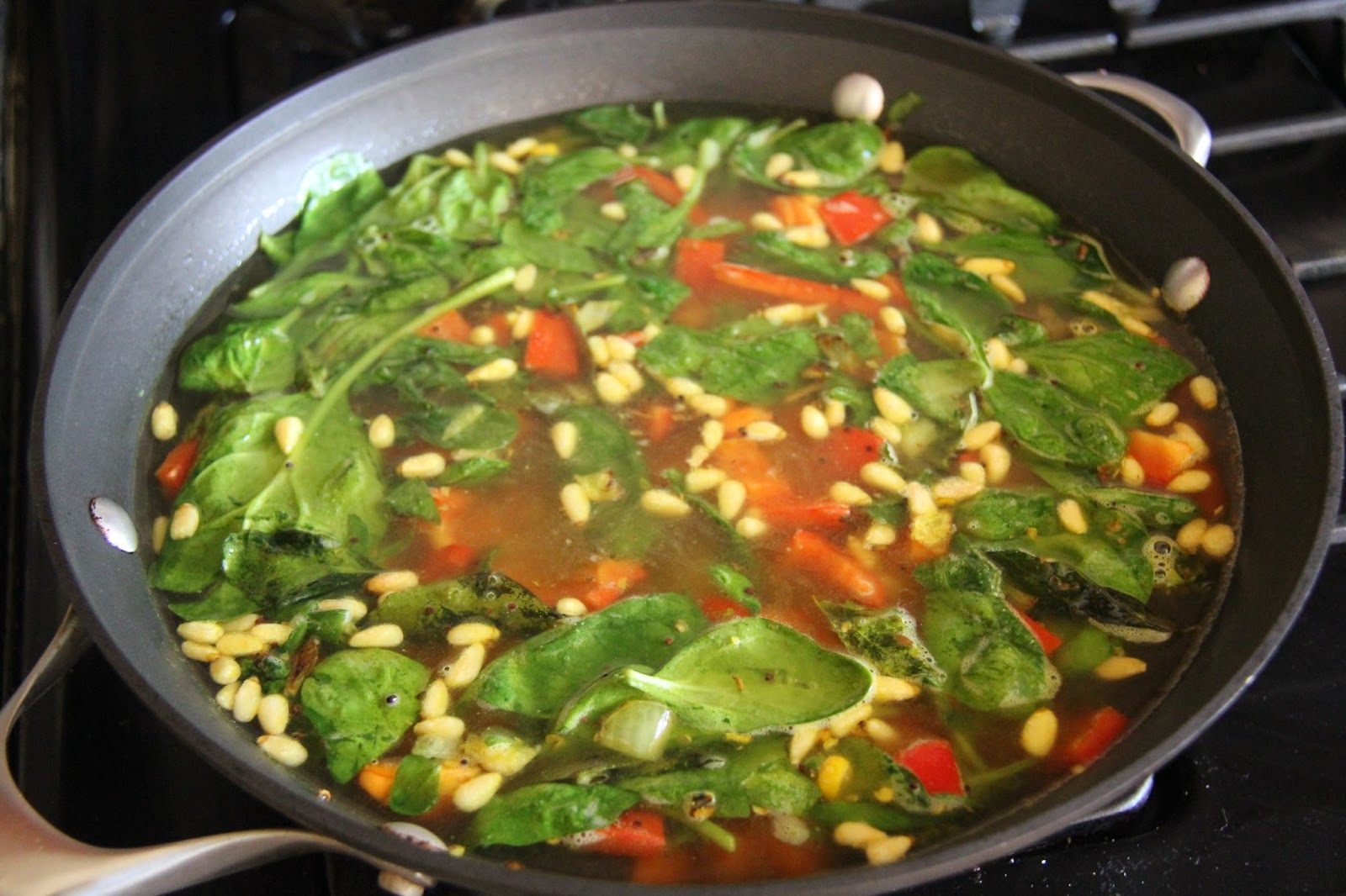 3.Add the peas,corn,carrot,sundried tomatoes and pine nuts and saute for 2-3 minutes, now add the red bell pepper and the spinach and add six cups of water and salt and let come to a boil.