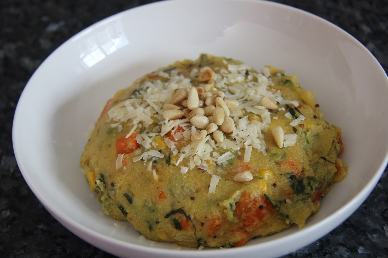 5.Dry Saute some more pine nuts on the side and top the polenta with cheese and pine nuts.
