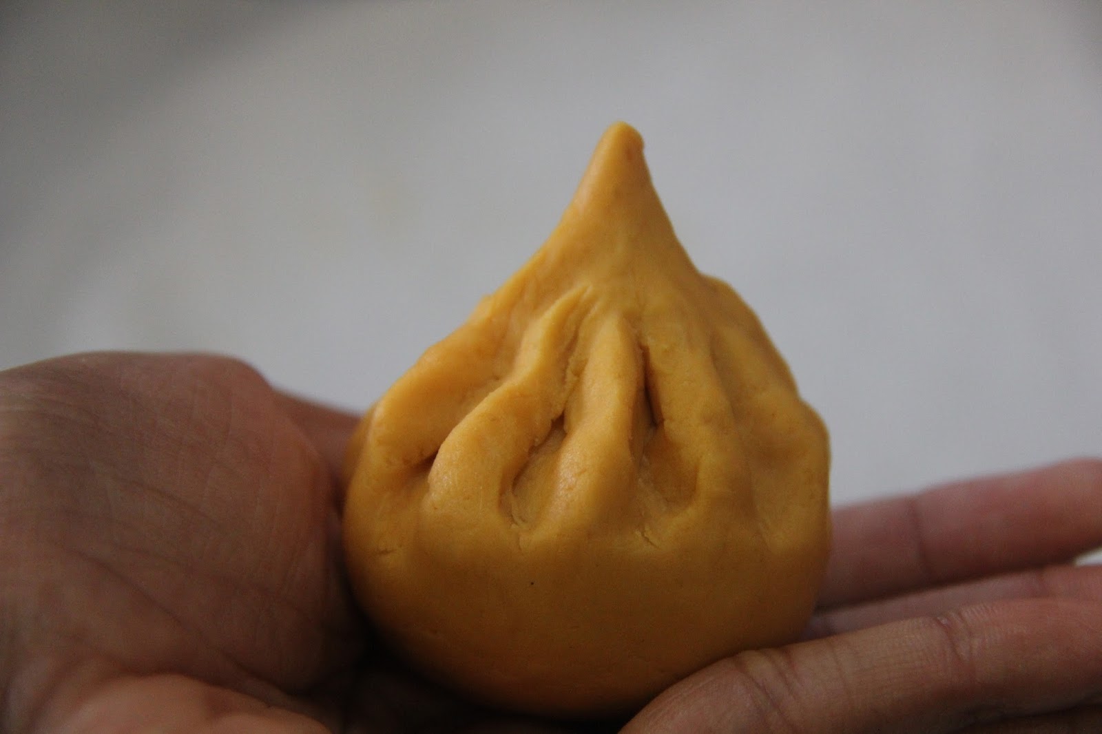 8.Now gently without hurting the shape press the top part of the pinched dough together in a circular motion and seal the top,remove excess dough if any.Repeat for all the dough.