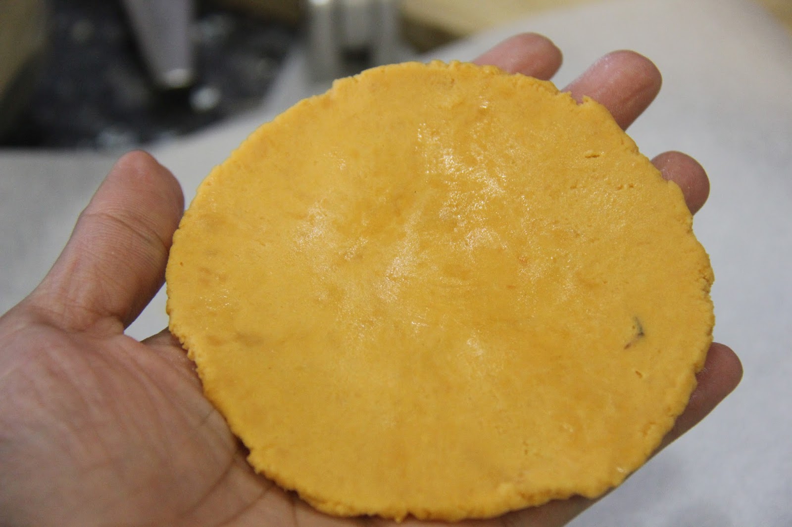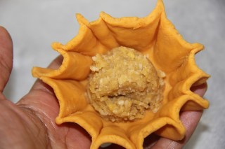 6.Scoop about 2 teaspoons of jaggery mixture into the center of the flat circle.