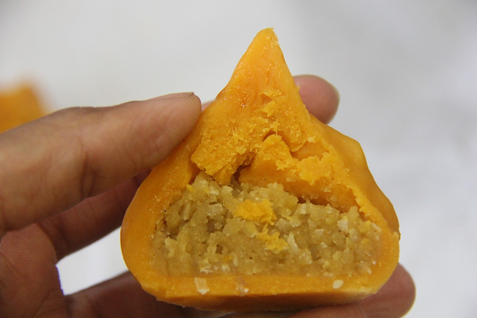 2.Cook the moon beans until just tender with water enough to cover them in a saucepan and drain excess water, the bean should be cooked but still hold the shape and yield only when pressed.Let it cool completely.