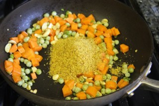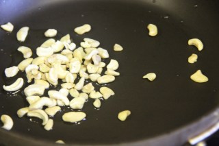 2.In a different pan add the ghee and saute the cashew nuts for 1 minute, then add the carrots and peas and cook until cooked.