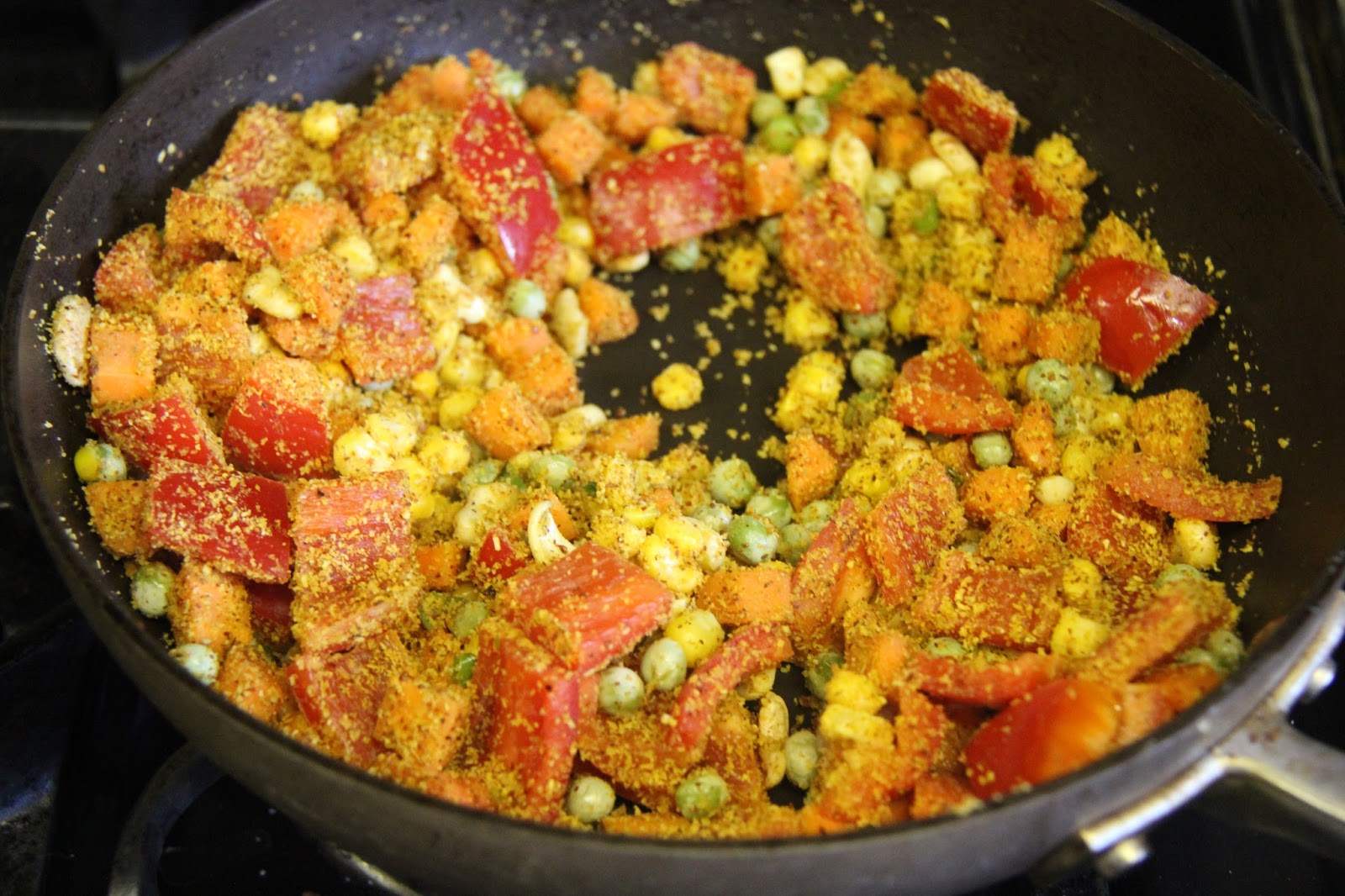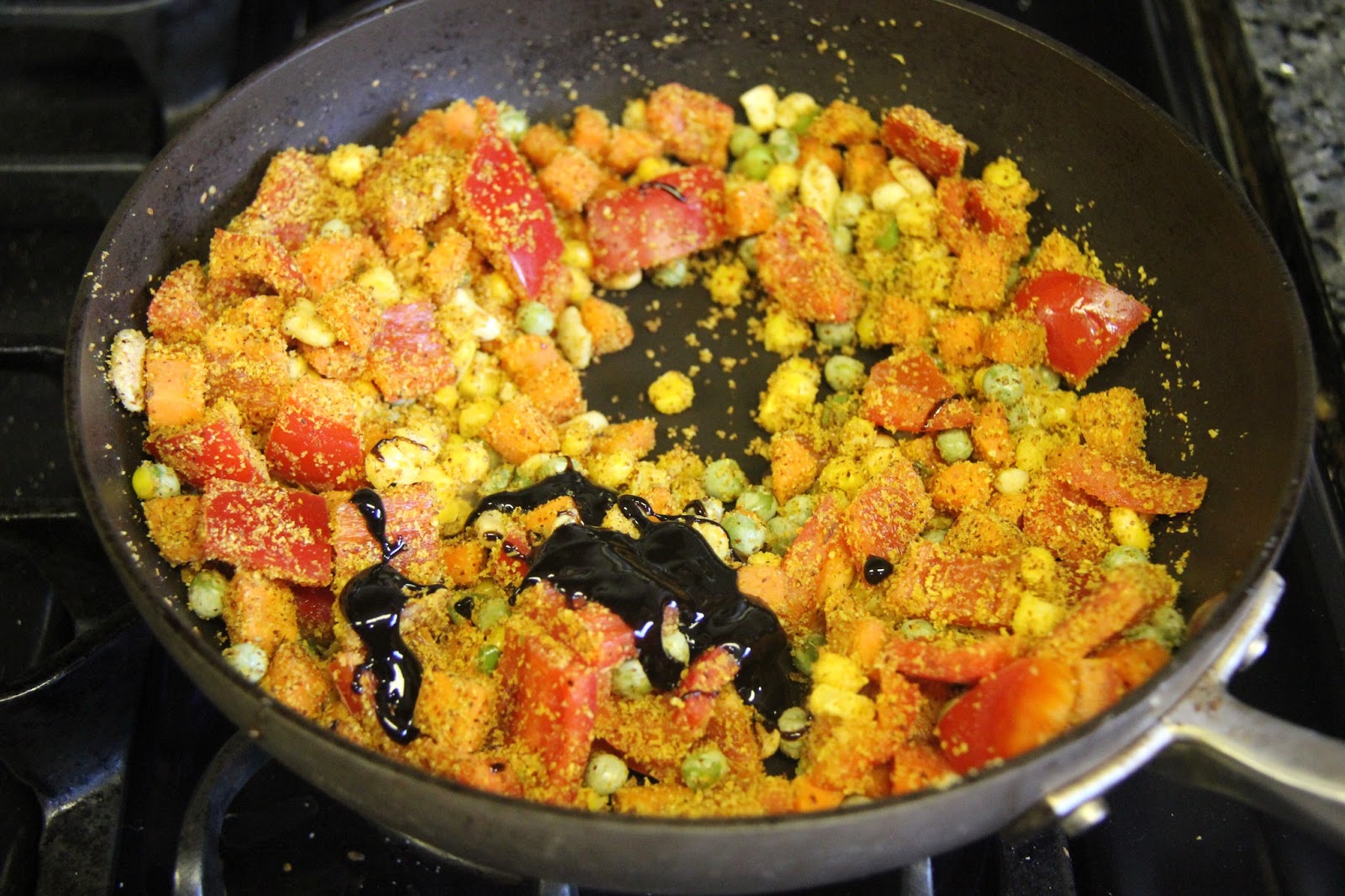 3.Add the spice powder and the bell peppers and corn and cook well.
