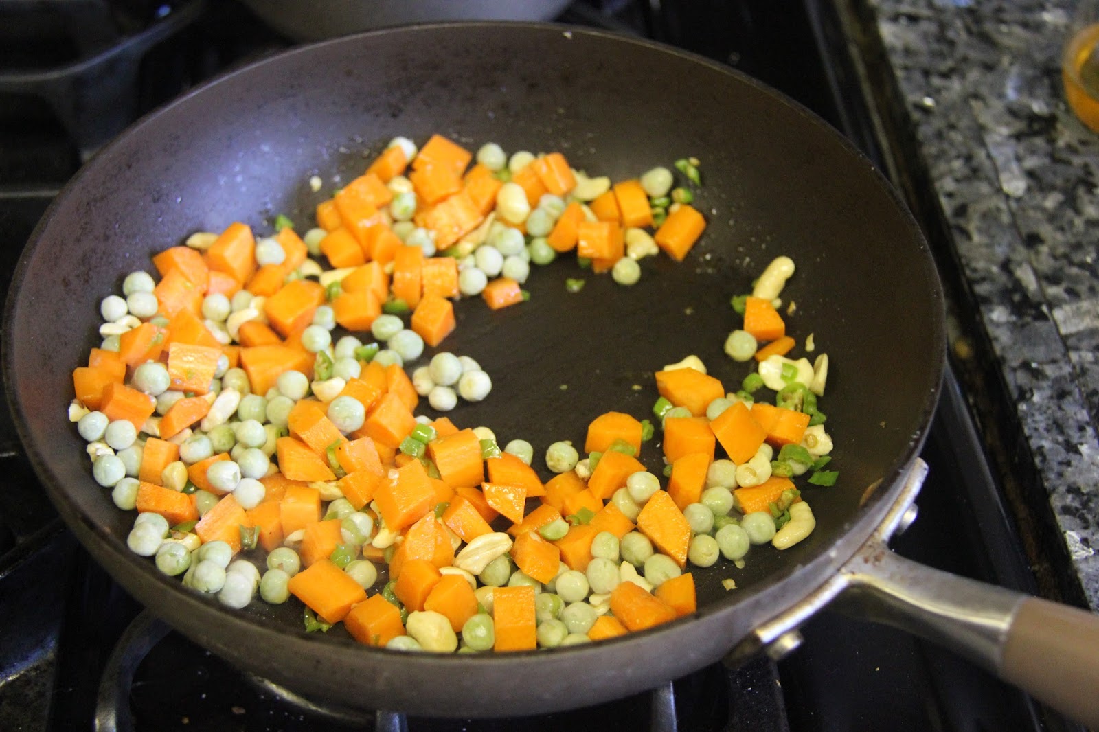 2.In a different pan add the ghee and saute the cashew nuts for 1 minute, then add the carrots and peas and cook until cooked.