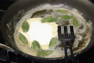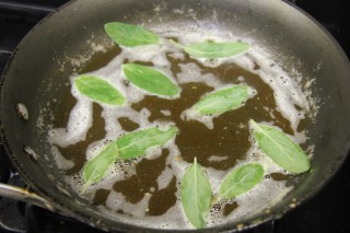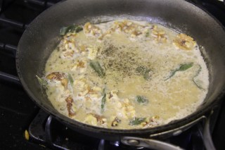 9.In a pan start melting the butter,add the sage and continue to cook on medium-low until it turns from a yellow to a nice brown color.Add the cream, Stir in wine and reduce to half.Now add the stock and reduce to half.Adjust salt and pepper.