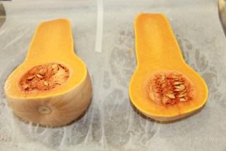 4.To prepare the butternut squash puree,slit the butternut squash lenghtwise, sprinkle oil and salt and pepper and roast in oven for about 1 hour at 375F.Let cool and scoop out the pulp into a bowl.