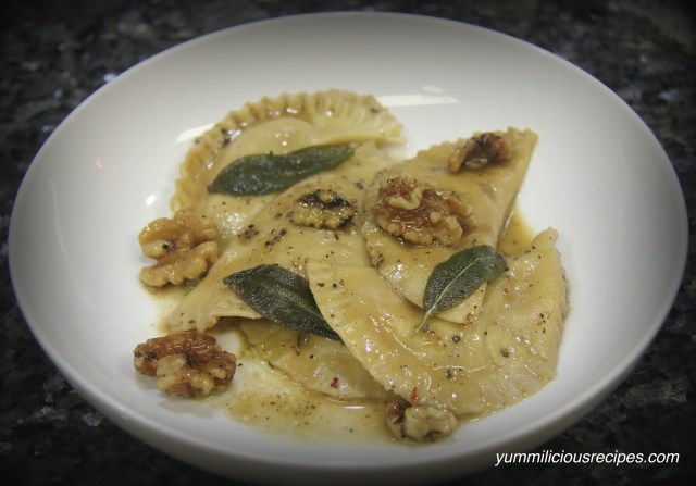 10.In another pan bring water to a boil add enough salt and place the mezzelune in it to cook for 3 minutes and drain and transfer to the brown butter sauce and coat well and sprinkle roasted walnuts on top.