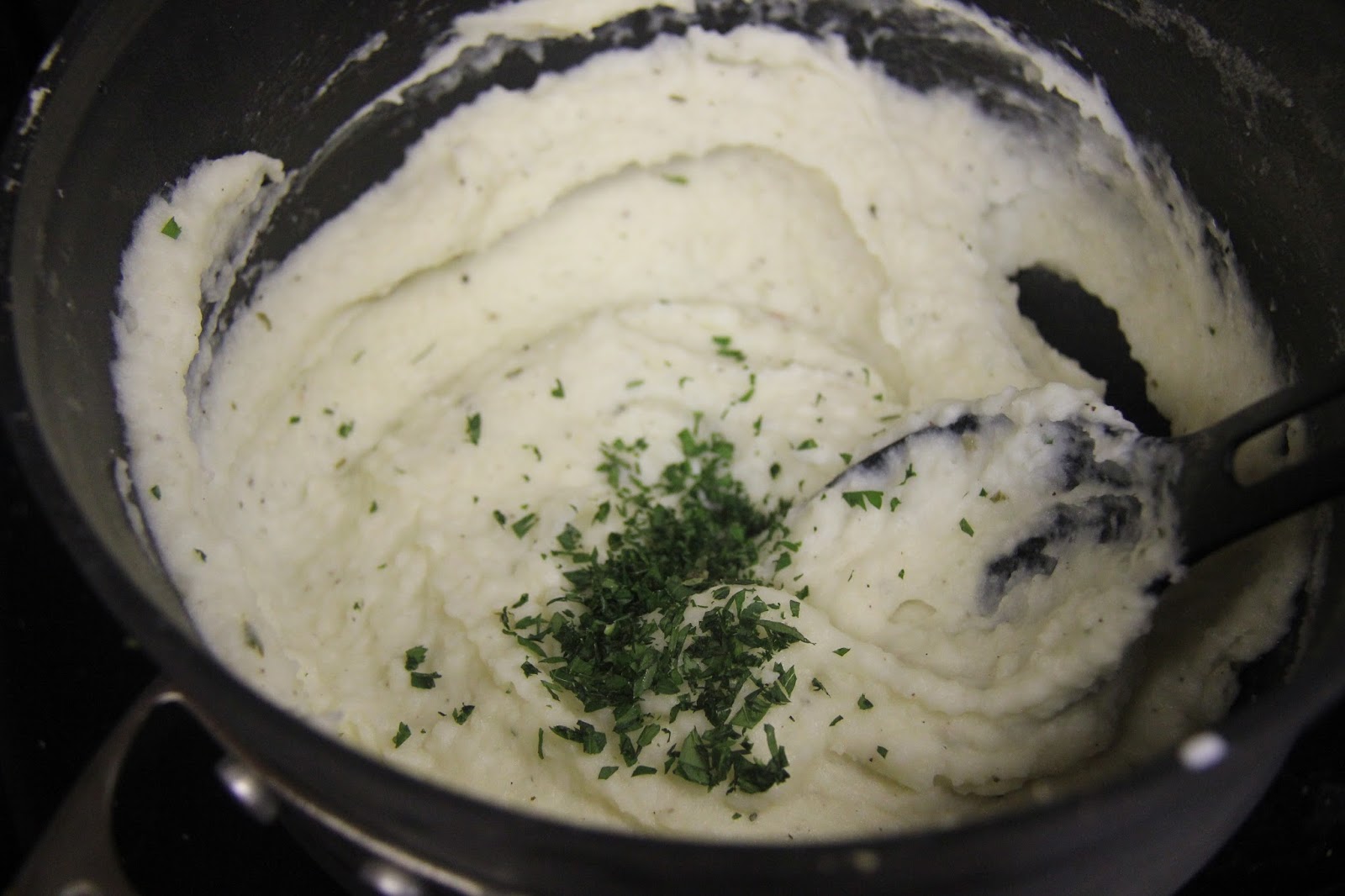 You can finish off the mashed potatoes with some truffle oil (sparingly) or olive oil.