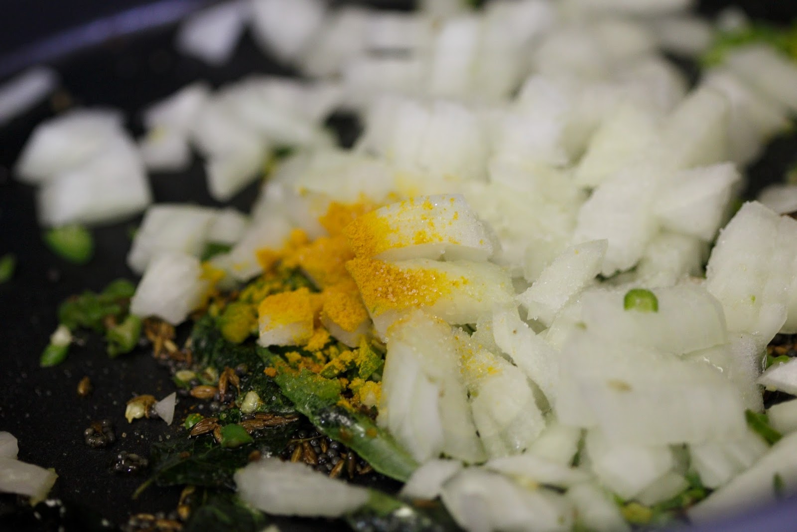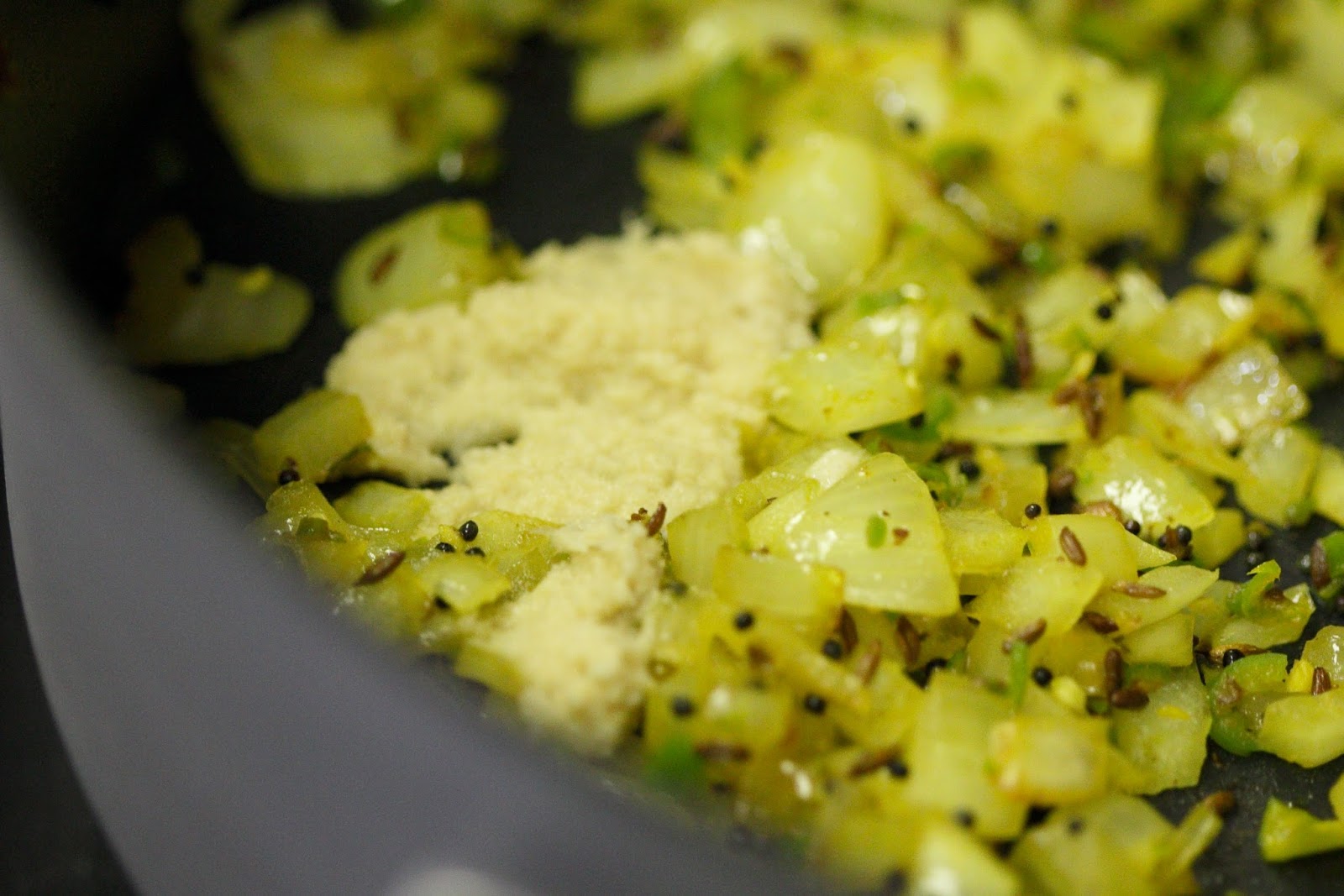 3.Add the onion,salt,turmeric and green chili and saute for 2 -3 minute until onions are soft and translucent.now add the ginger garlic paste and saute for 1 more minute on a medium flame.