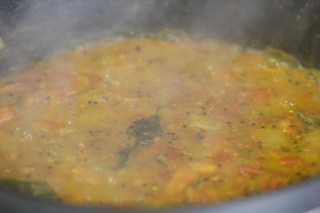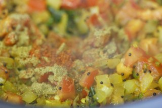 4.Now add the tomatoes and spices and saute for 2 minutes, add 1 cup of water and cook until tomatoes are soft.