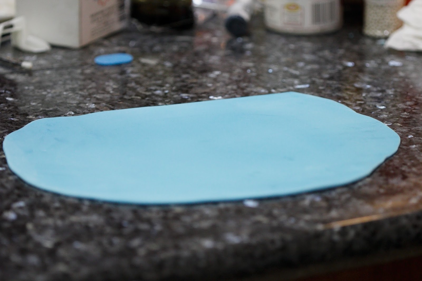 5.Roll out another piece of lighter blue or white fondant with height that will reach the shoulders of the doll from the cake board and width that will come across both sides of the doll.