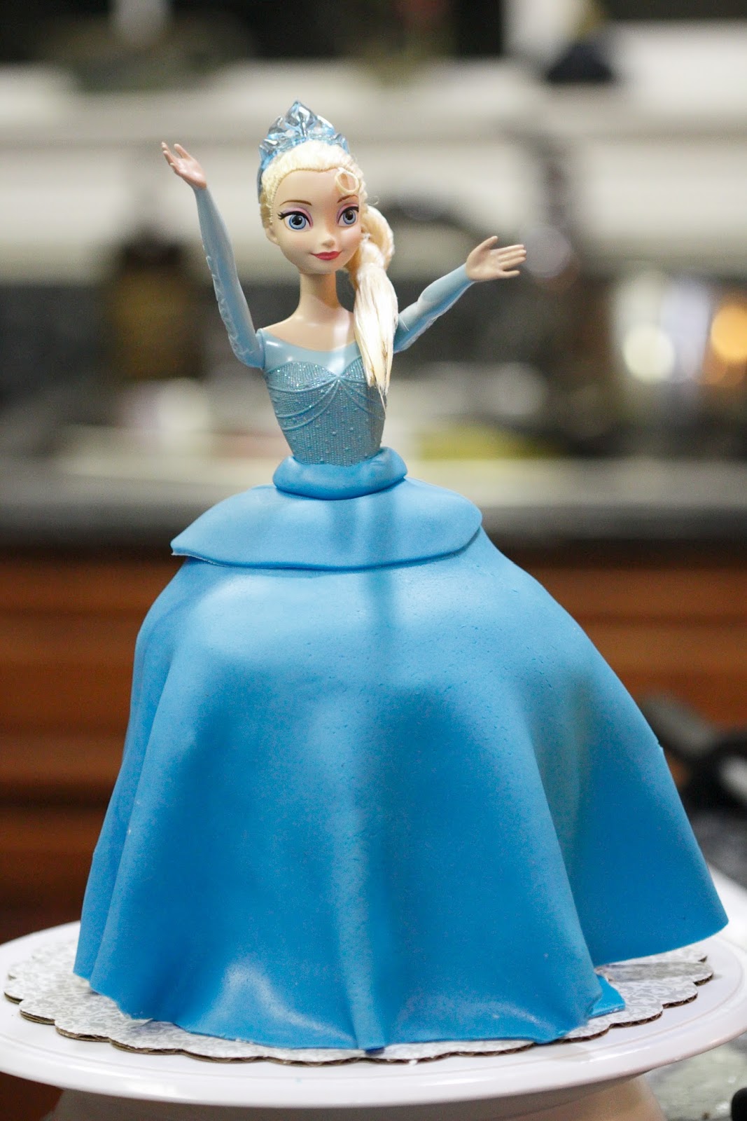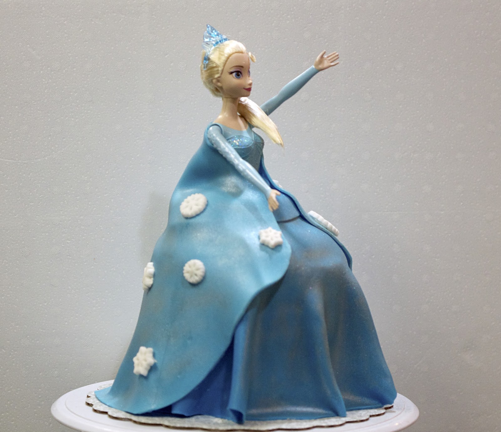2.Now , remove the skirt of the Elsa barbie doll.Wrap her legs in surround wrap. Make a hole in the center of the cake and scoop out a hole from all the layers so you can push the doll in without hurting your cake. Keeping all the layers in place gently push the doll inside so the legs tough the bottom.IF you are making a bigger/taller cake, it need not touch the bottom.If using a 5 th layer trip the top layer to give the shape of the skirt.I just used an extra layer of the dome of another layer to give that effect.If you top layer cracks thats fine, because the fondant is going to cover all of it anyway.Apply buttercream all around covering the entire cake.