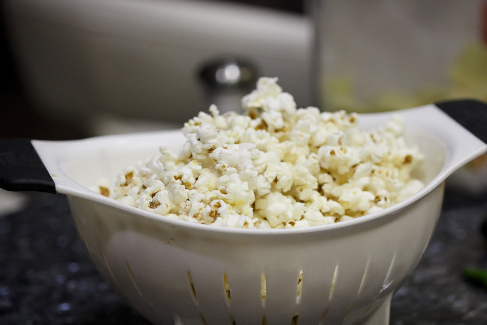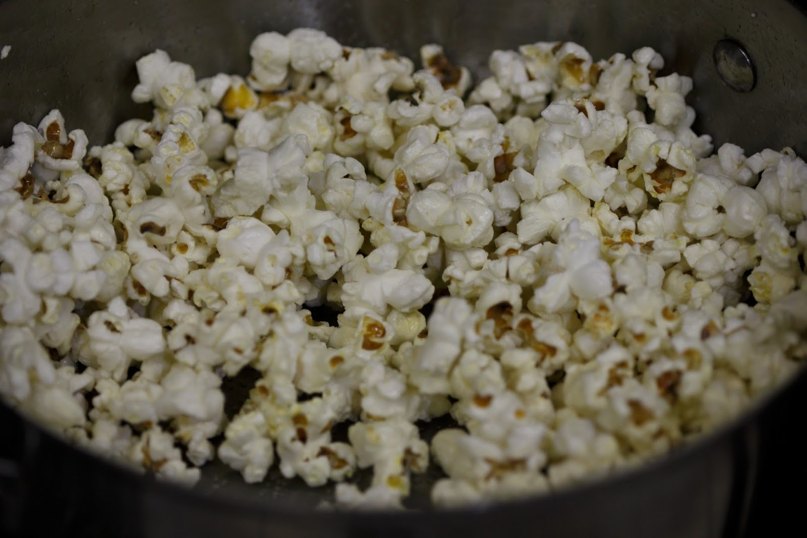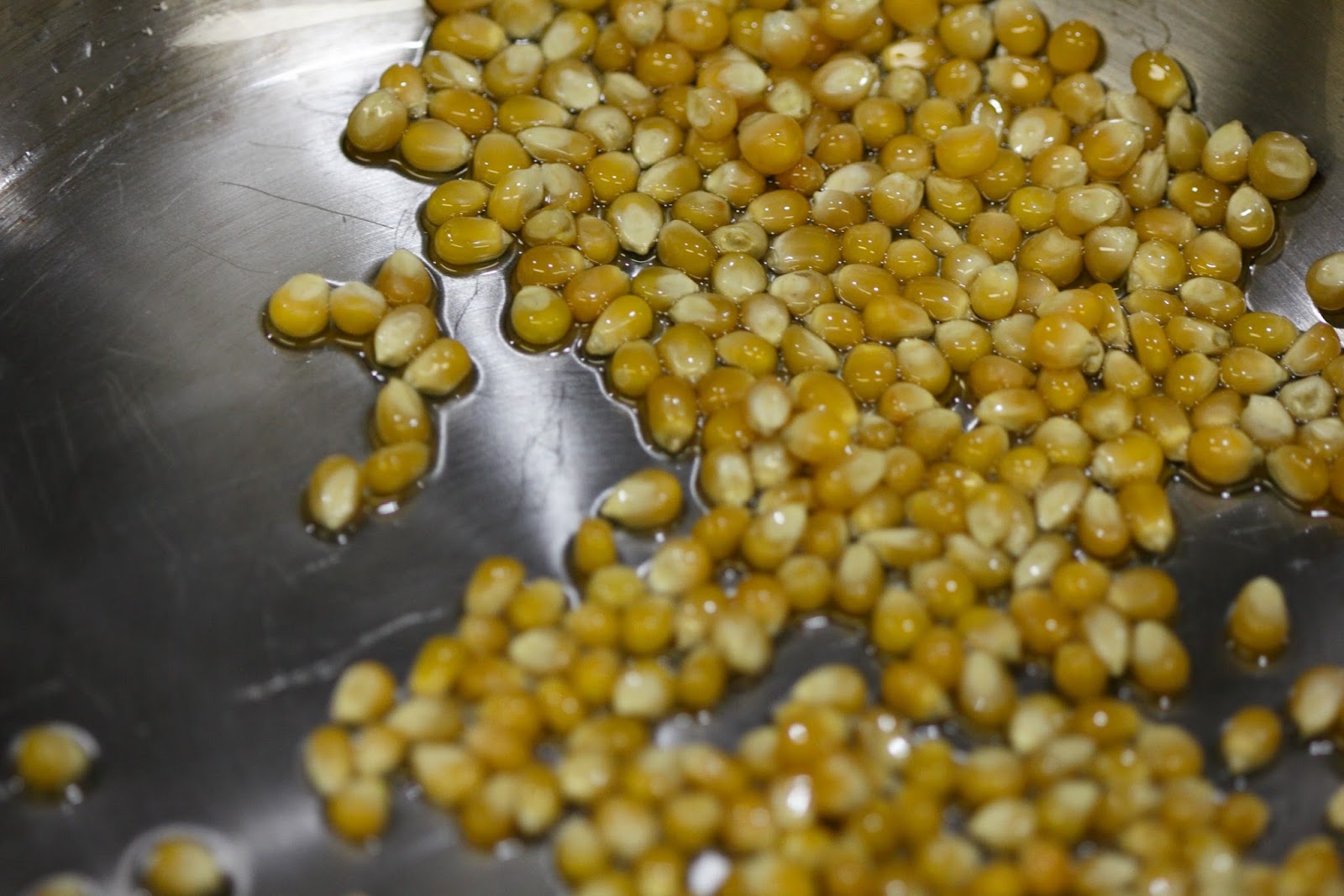 2. Put popcorn kernels into the oil and give them a gentle toss in the oil and wait for about half a minute until the kernels start to pop.Immediately cover the pan and let the popcorn pop until you hear the popping slowdown, immediately transfer to a wide bowl to let the popcorn cool.