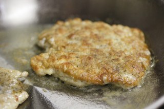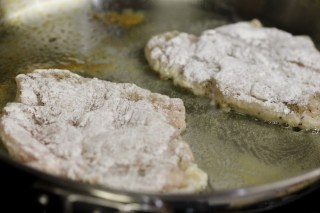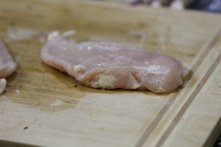 4.Heat the oil in a pan and place the chicken breasts on one side and cook for about 2 minutes until lightly browned.Flip to the other side and let cook for 2 more minutes until light brown on a medium flame.