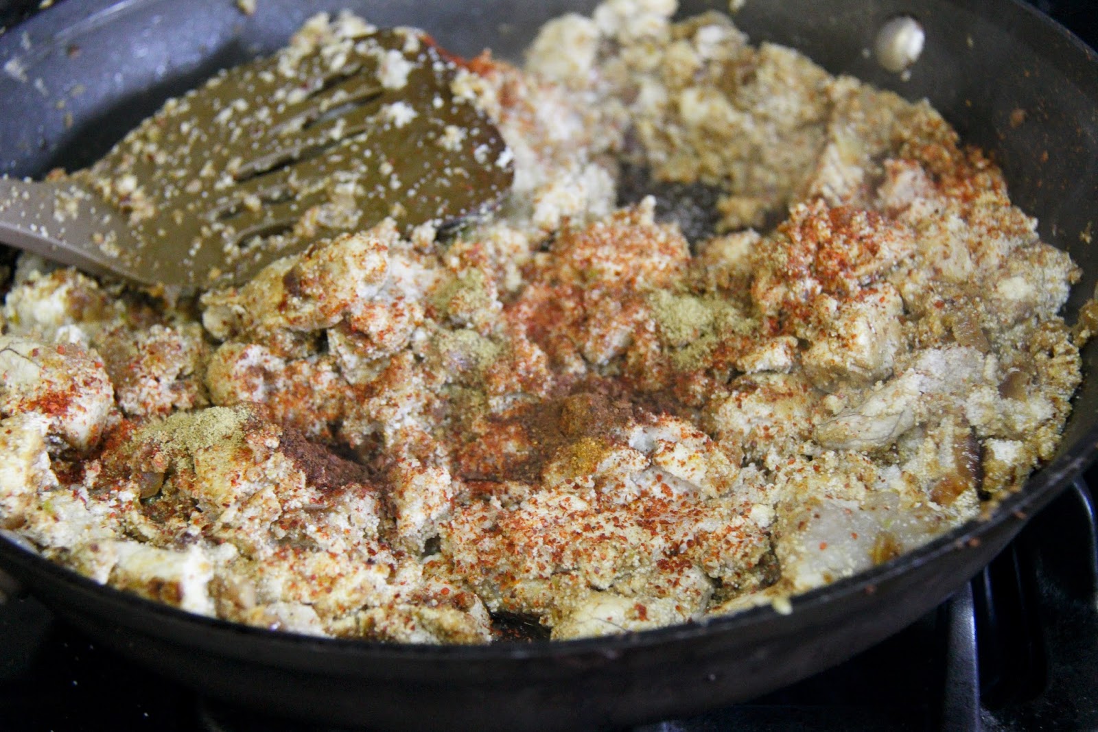 2. Add ginger garlic paste and saute for 1-2 minutes on medium flame. Add curry leaves, tomato paste, coconut and spice powders and saute 3-4 more minutes till oil oozes out.