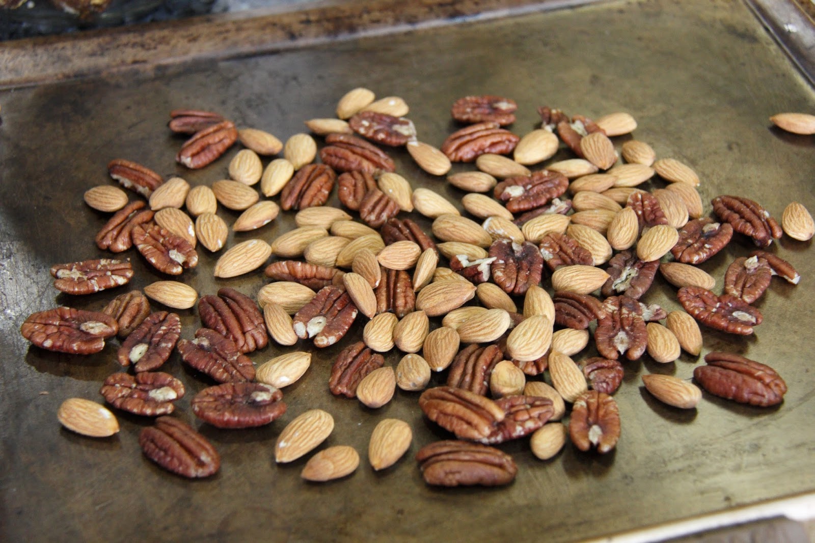 1.Heat the oven to 350F . Toast the almonds and pecans in the oven for 10 minutes and chop them to smaller pieces separately.