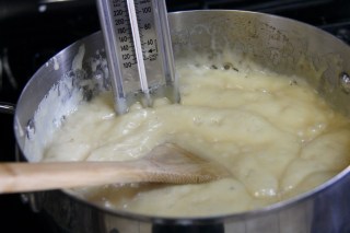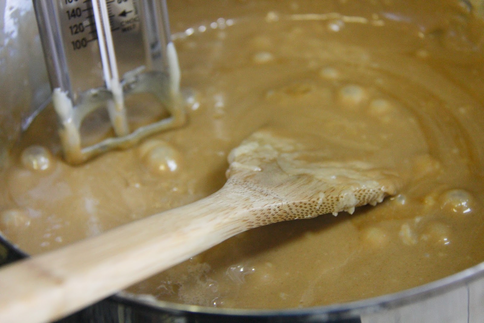 5.If you have a candy thermometer let the mixture go till it reaches 290 F .Or syrup dropped in ice water should separate to threads and break with a snap.