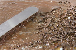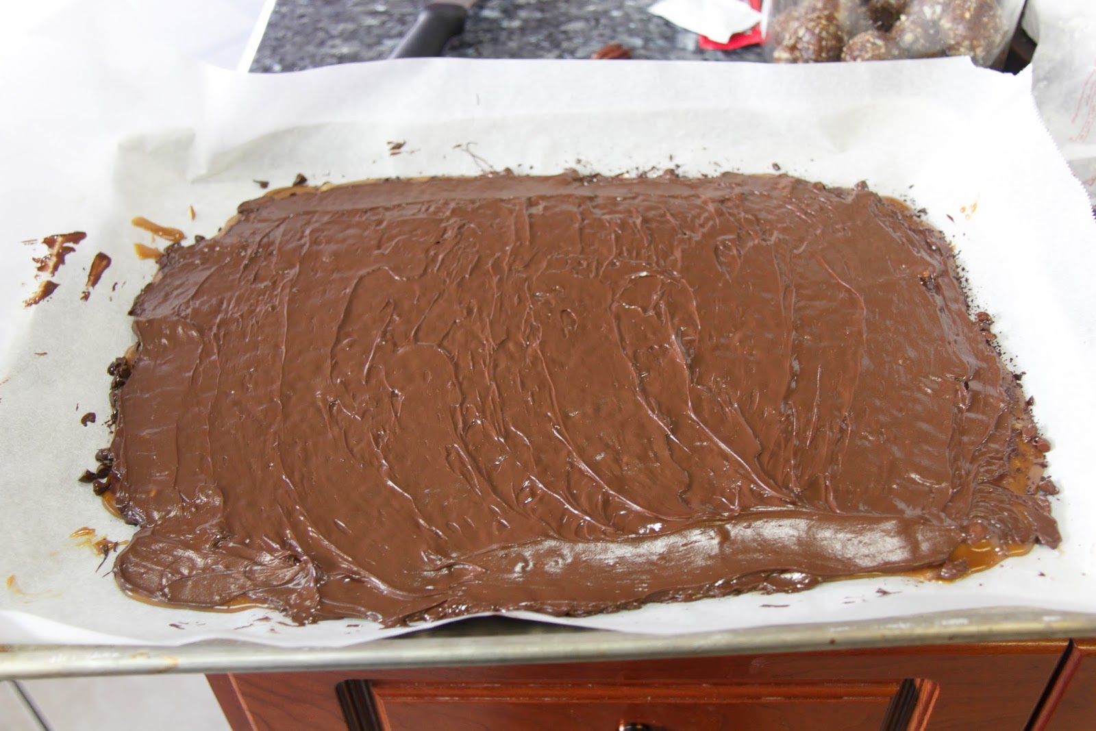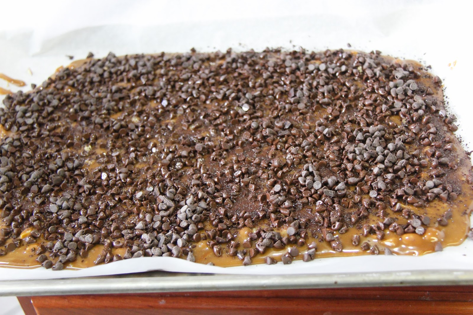 7.Sprinkle the chocolate pieces on top evenly and let melt for a minute or two and then spread with a spatula to evenly coat the toffee.