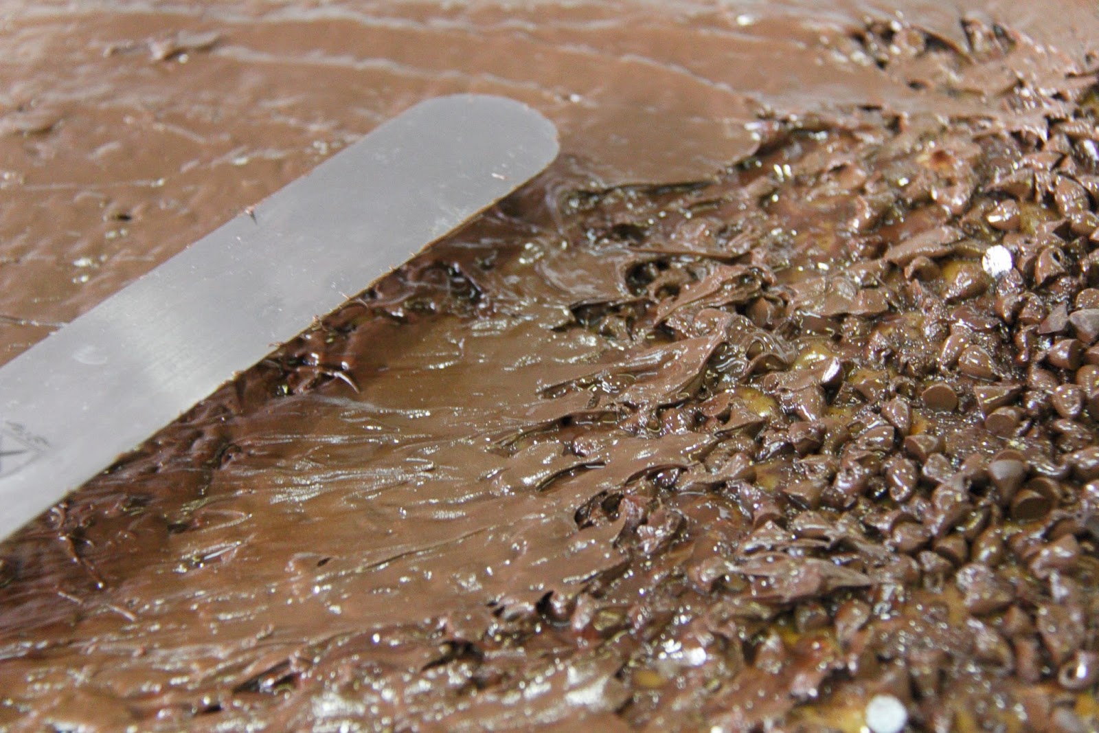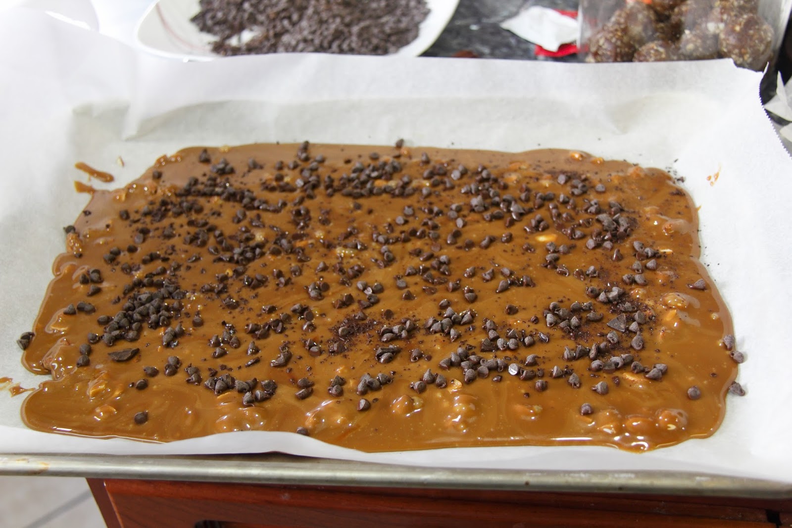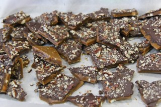 Using chocolate chips makes it easy to make toffee.For more perfection, use tempered chocolate after the toffee has cooled down.