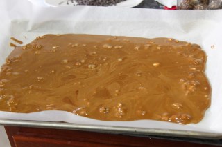 6.Immediately transfer the mixture onto the almonds on the parchment paper.Let cool 2 minutes.
