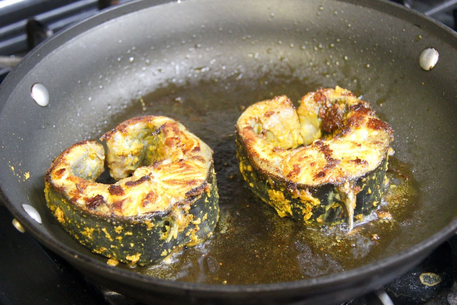 3.Heat remaining oil in a frying pan, pan fry the fish on both the sides on medium flame till golden brown.If your fish is too thick it will take longer to cook, you might have to cover it or place the pan in oven at 400F for 5-10 minutes to get the interior cooked.