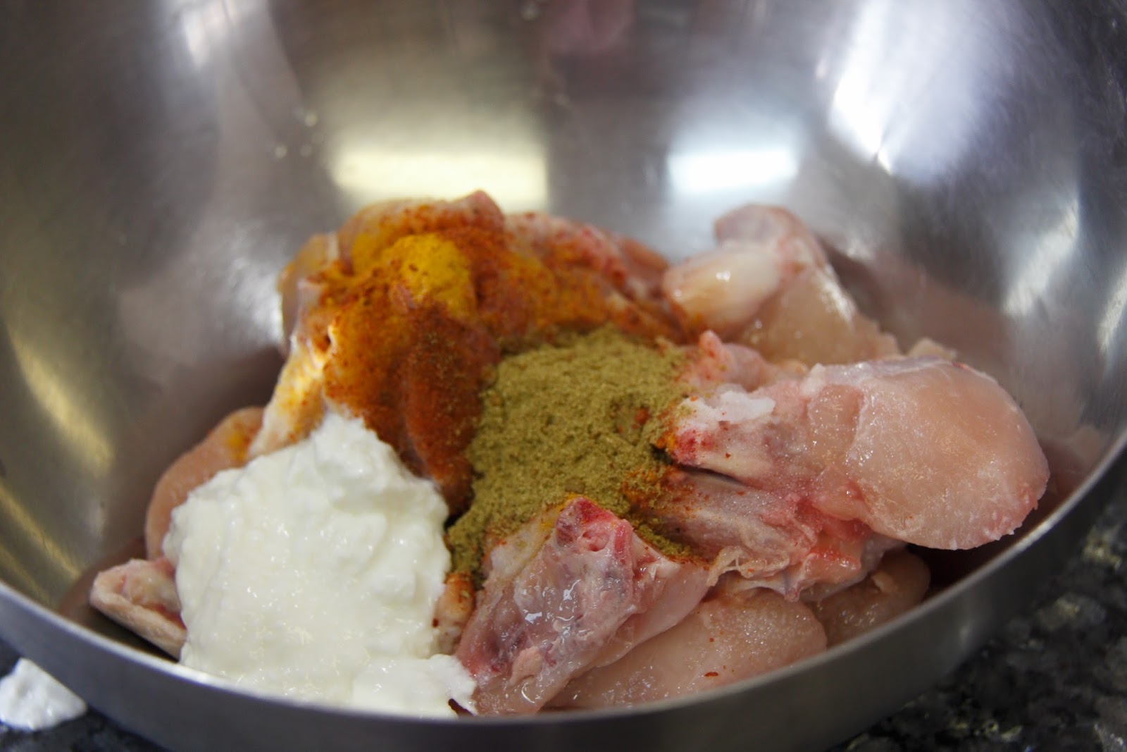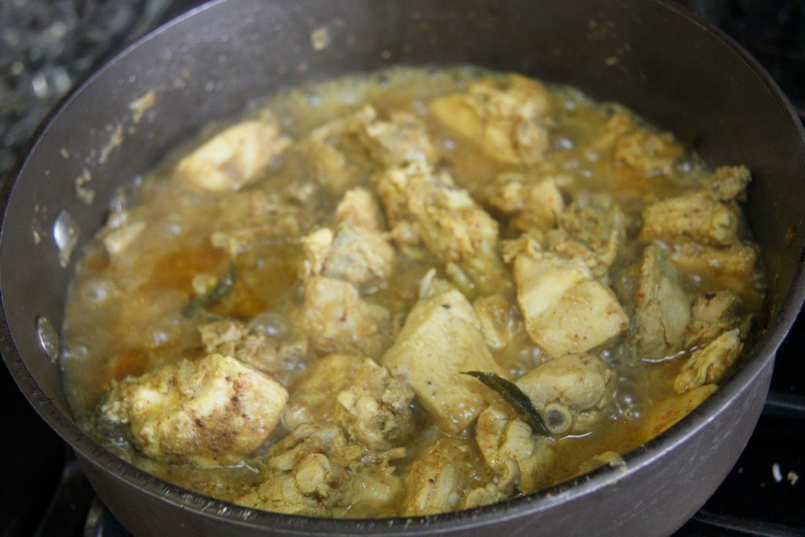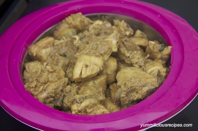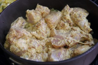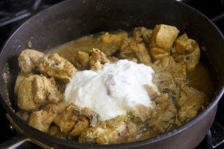 4.If your chicken is fresh it should release enough water in which you should be able to cook the chicken by covering with a lid, else add 1/2 to 1 cup of water enough to cover the meat and the remaining yogurt, adjust salt and spices and let cook on simmer (medium low) for about 10-12 minutes by placing a lid and stirring occasionally.Taste a piece and Check for doneness and turn off the stove.If its still a little pink cook for 5 more minutes.
