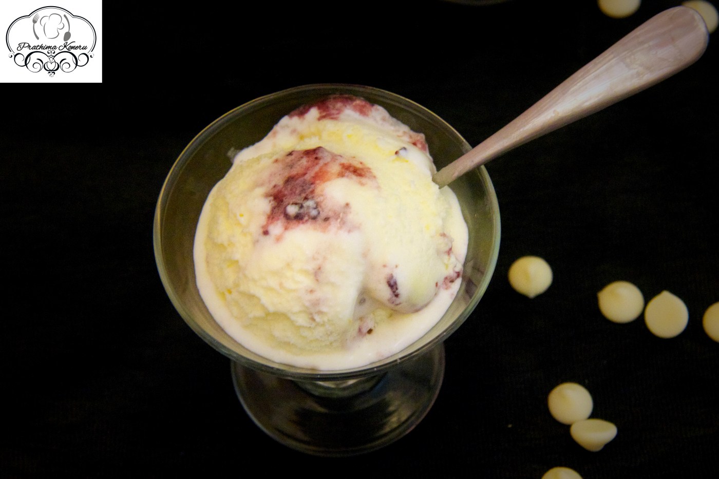 7.Transfer the mixture to a container swirling in raspberry preserves and white chocolate chips in between.